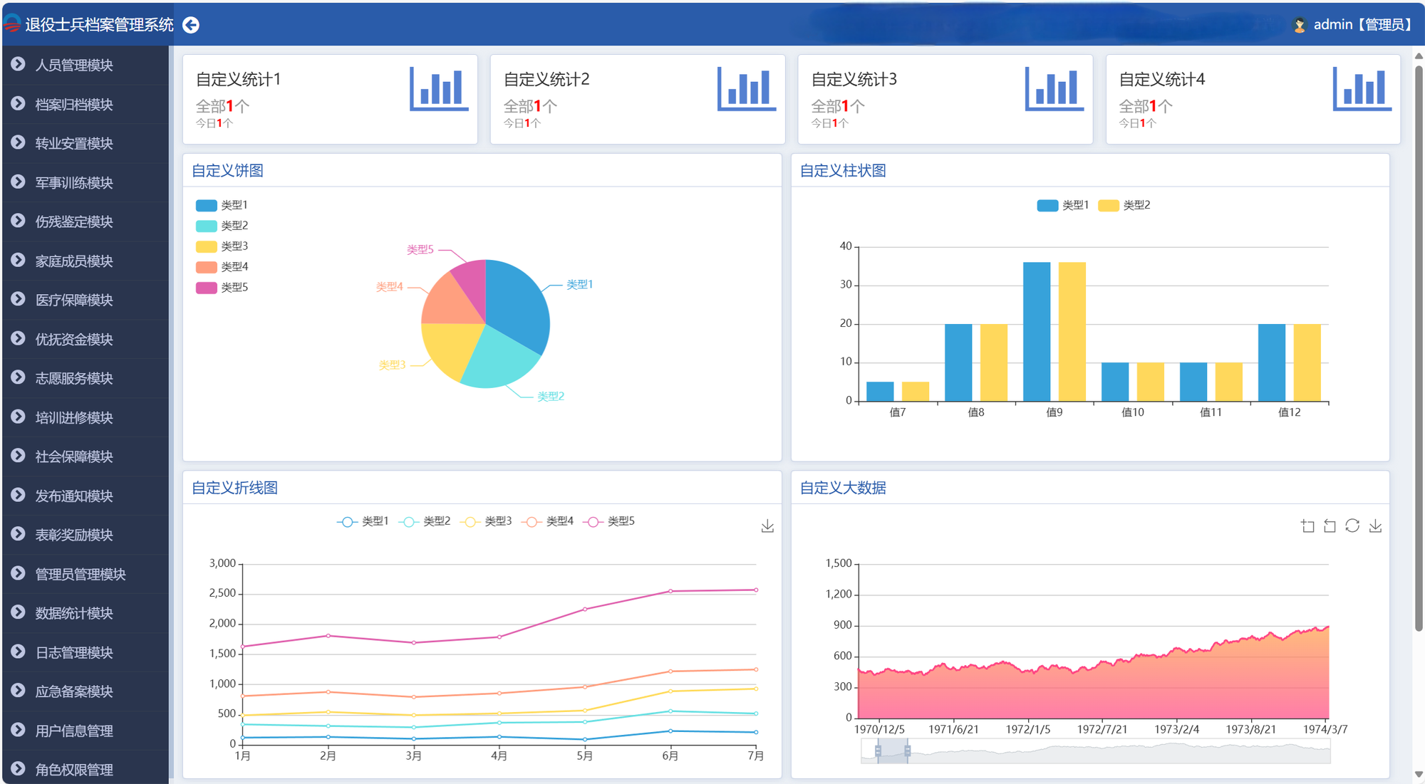 数据概览:主页展示系统关键数据的概览,如退役军人人数、档案数量、档案归档进度、待处理任务等。