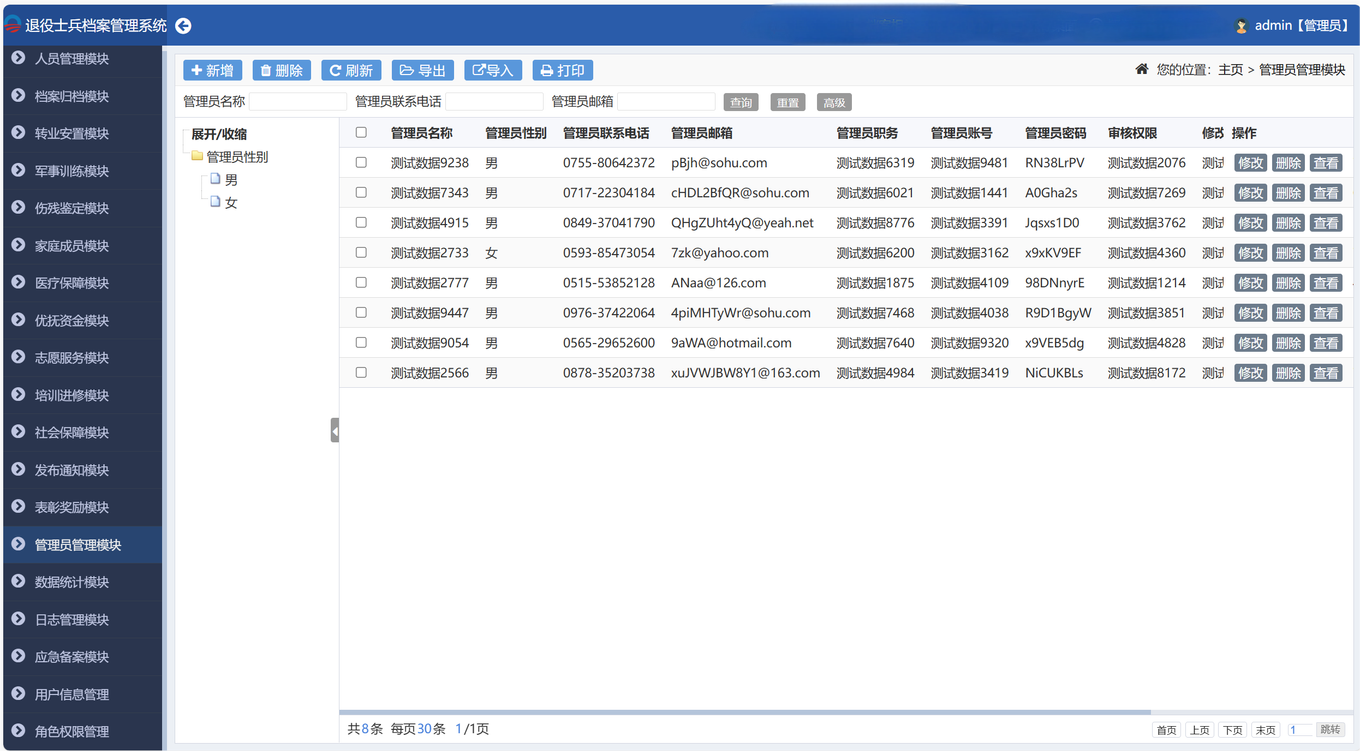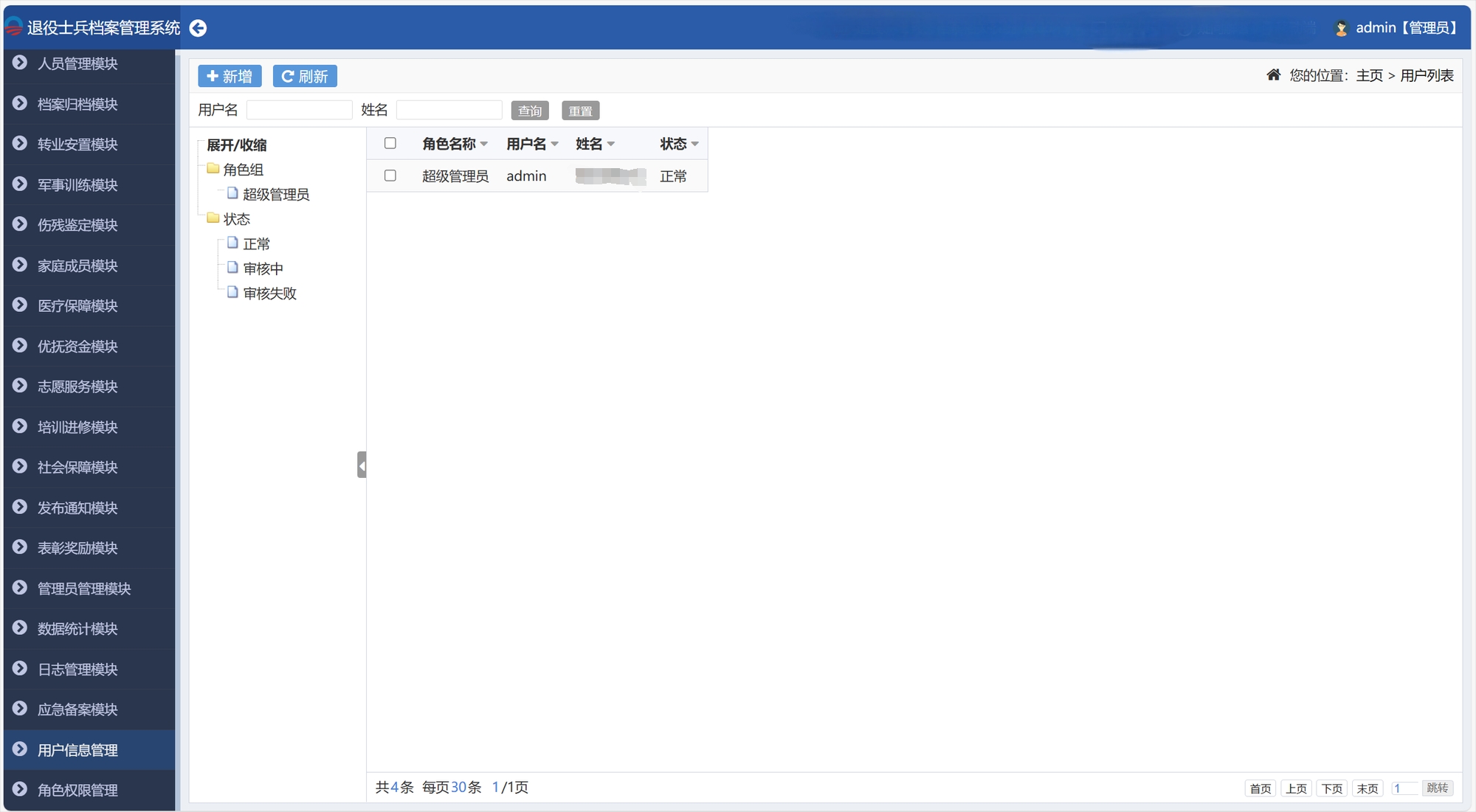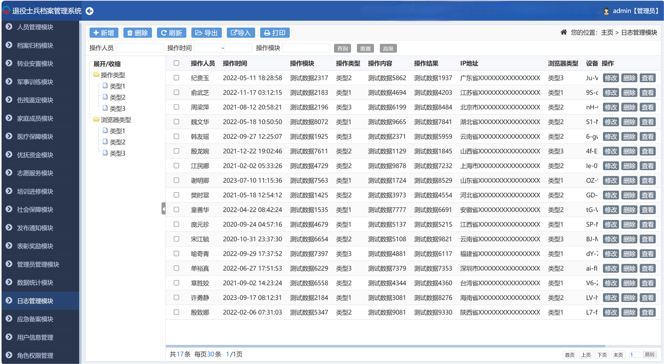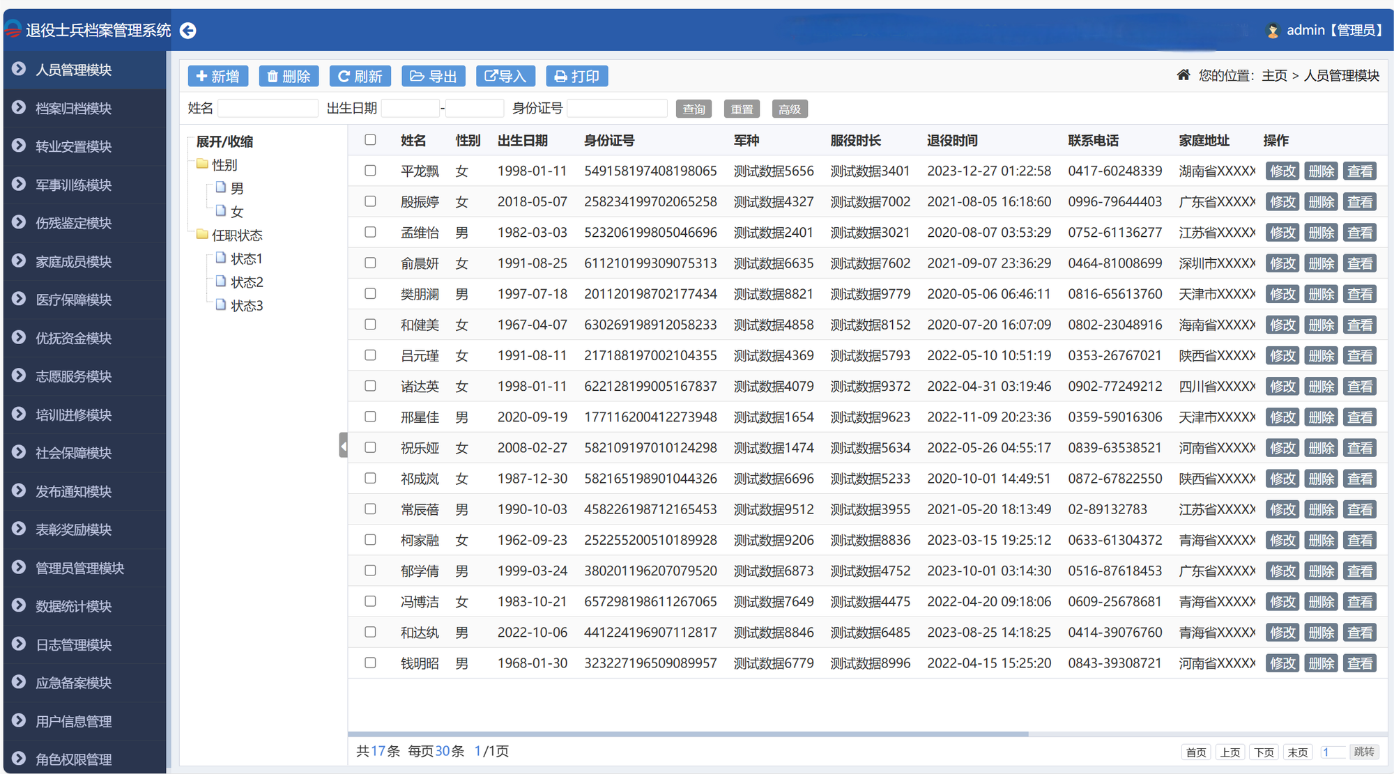 信息录入:支持批量导入和手动录入退役军人信息,包含基本信息(姓名、性别、出生日期等)、服役信息(服役单位、服役时间等)、退役信息(退役时间、安置地点等)。