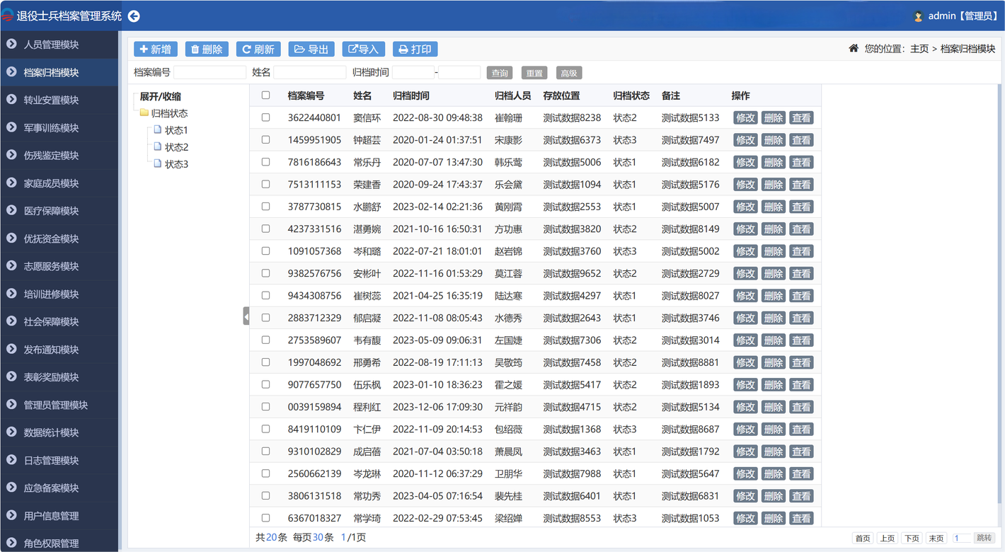 退役军人人事档案管理系统是一个高度集成的信息化平台,专为管理和维护退役军人的人事档案设计。该系统不仅能够有效地管理庞大的档案数据,还能提供多种便捷的功能来提升档案管理的效率和准确性。以下是该系统的详细功能介绍。